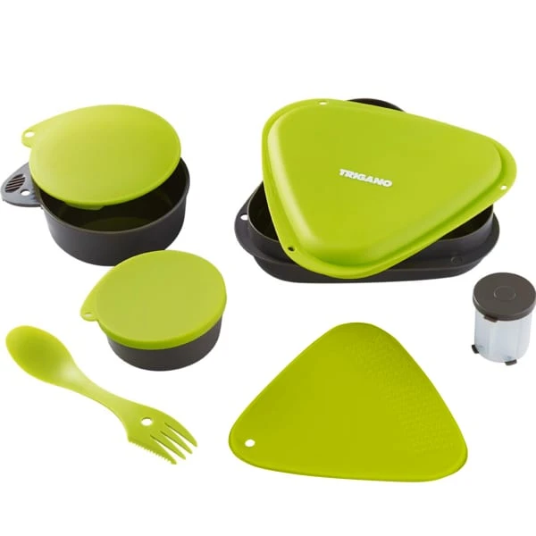This all-in-one set consists of several elements to eat comfortably. In addition to a resealable lunch box (which serves as a plate), this set includes two resealable boxes, a spork (fork/knife/spoon combo), a cutting board/pot and a spice jar.